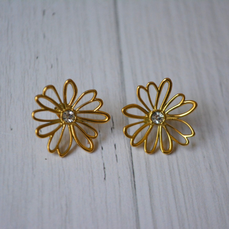Hermosos aretes de florecitas con pétalos y brillito. Acero inoxidable. No pesan