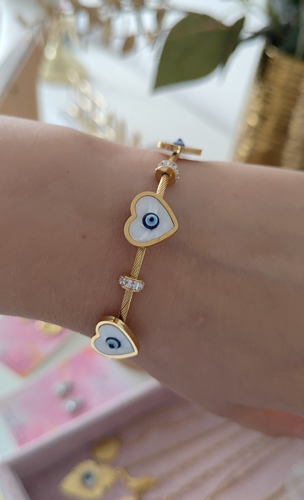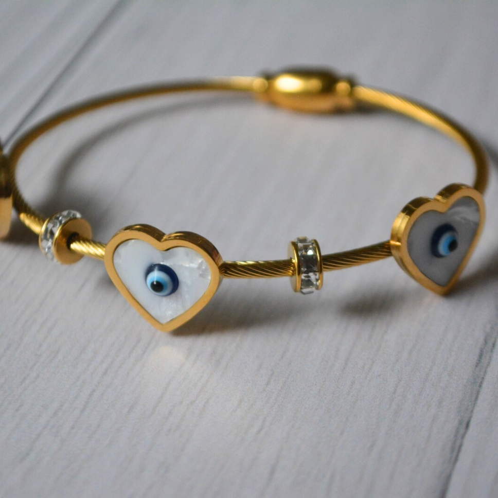 Hermoso brazalete con ojitos turcos. Acero inoxidable, hipoalergénico y resistente al agua.