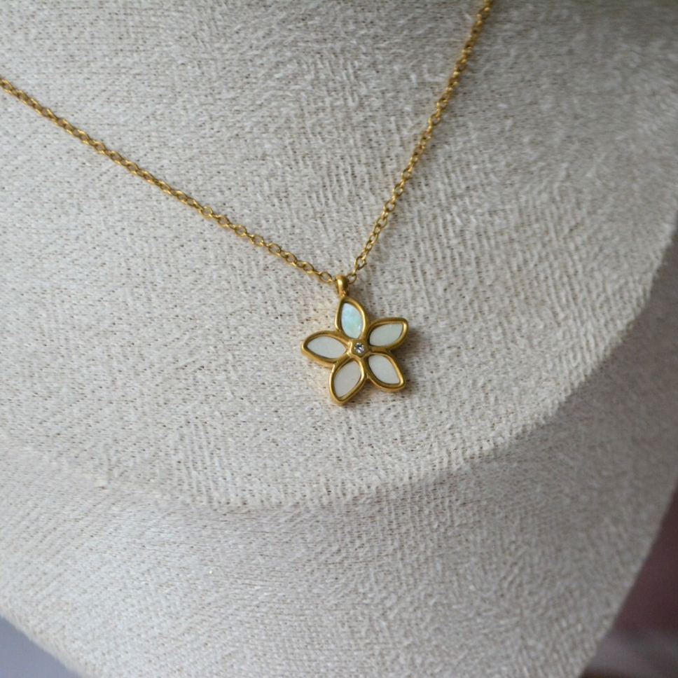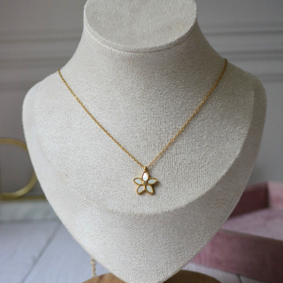Hermoso collar de florecita nácar. Acero inoxidable. Hipoalergénico y resistente al agua.