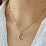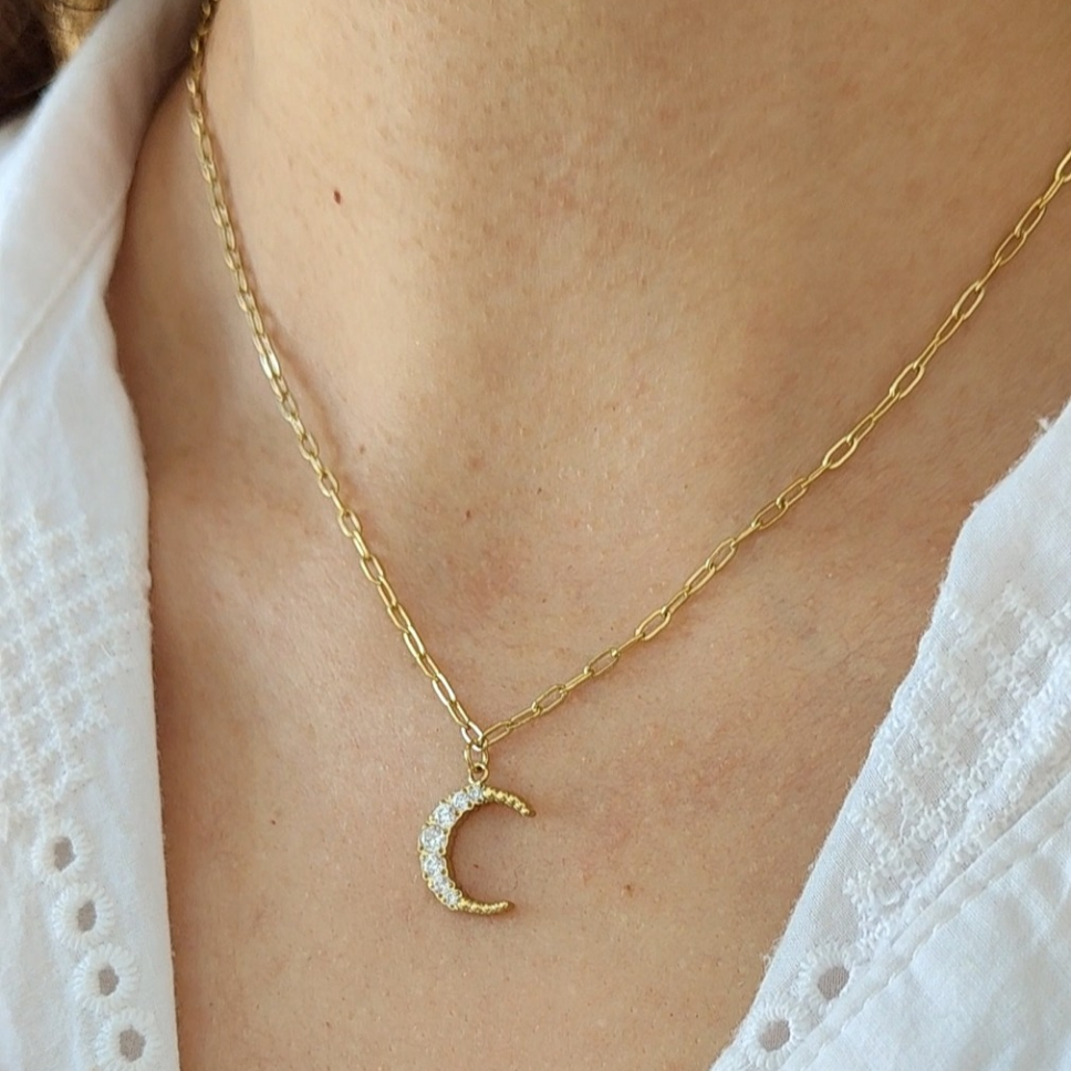 Hermoso collar de lunita con cristales en fina cadena de eslabones de clip . Acero inoxidable hipoalergénico y resistente al agua.